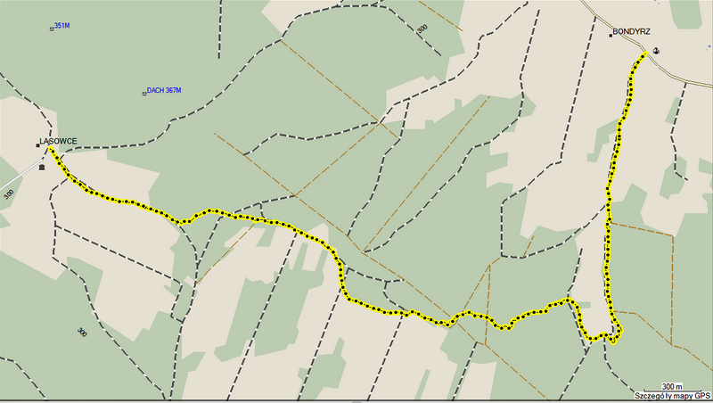 na odcinku Bondyrz - Lasowce Uprzejmie informujemy, że przebieg szlaku na obecnie dostępnych mapach turystycznych Roztocza jest niewłaściwy.
