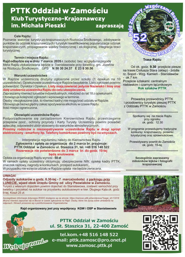 Zapraszamy na pierwszy w tym roku a już 52 Rajd Zimowy „Wzgórzami Roztocza”. Rajd odbędzie się bez względu na pogodę jeszcze w zimie 7 marca 2026 r.